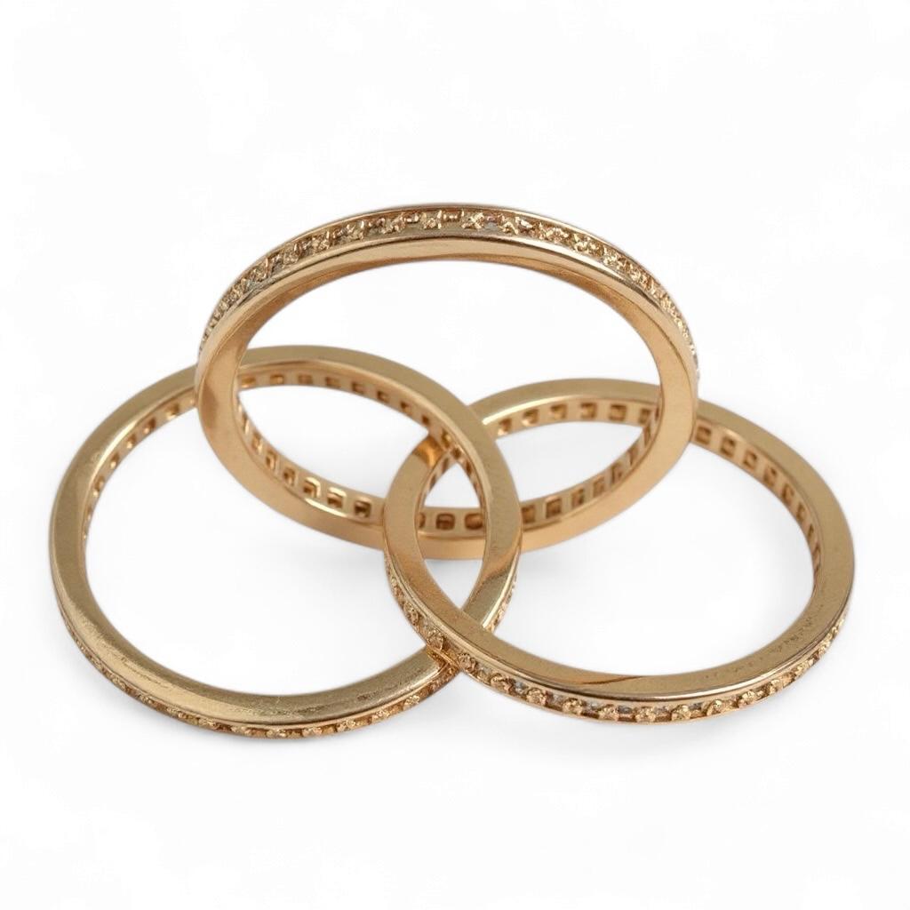 Moderno anel 3 alianças entrelaçados com zircônias brancas, banhado a ouro 18K