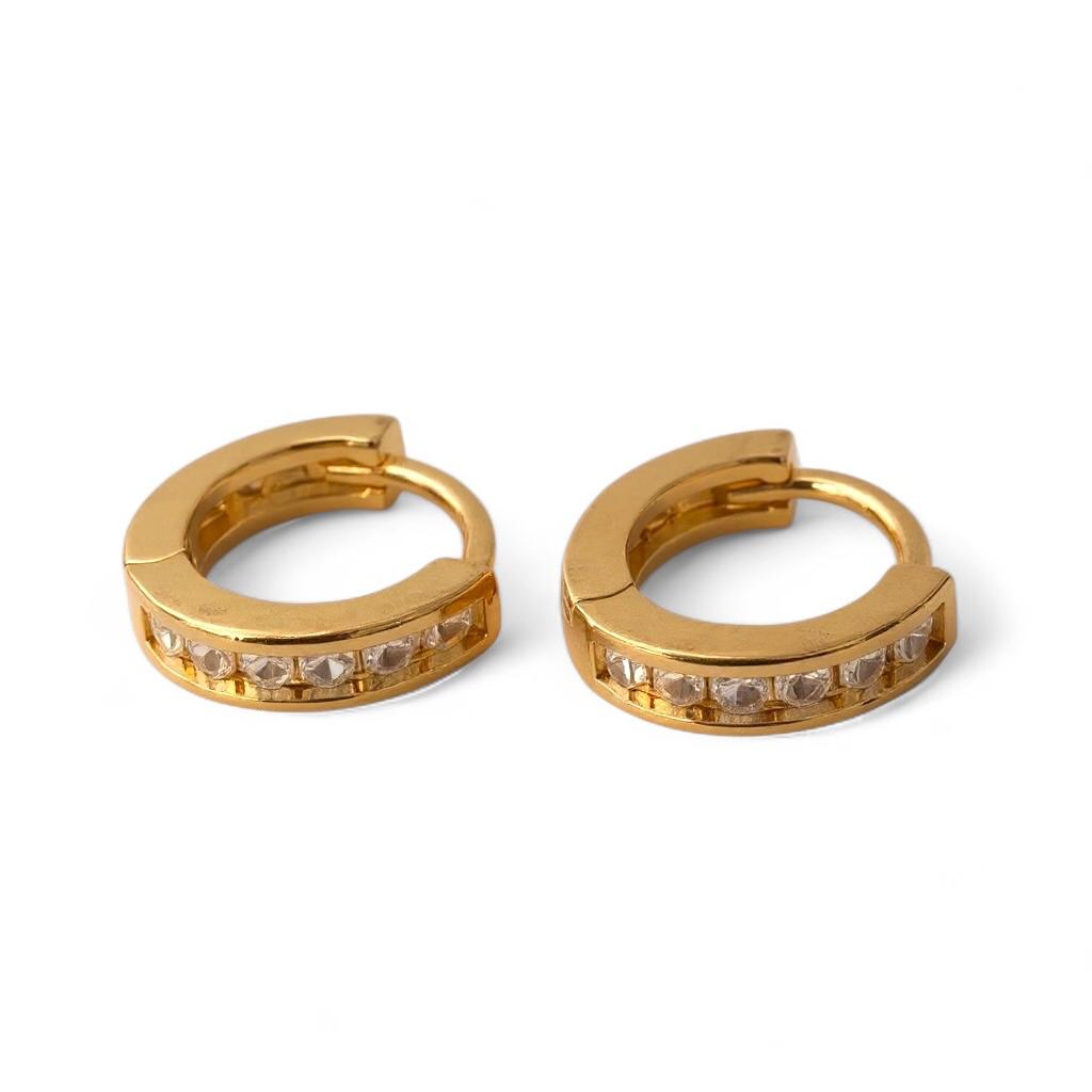 Um delicado e pequeno brinco de argola tamanho P, com borda e zircônias brancas, banhado a ouro 18K