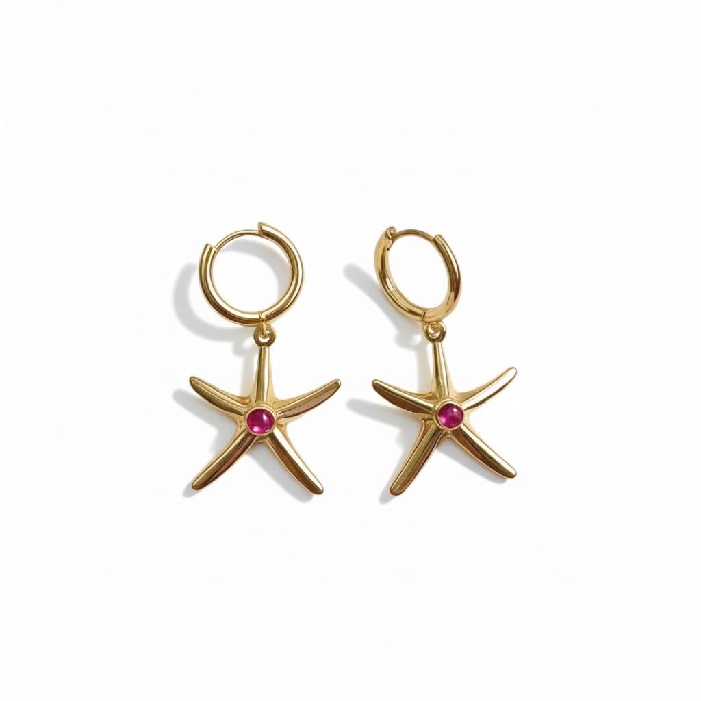 Brinco de argola banhado a Ouro 18K, que traz o charme da estrela do mar em um design leve, finalizado com um cristal rubelita central que adiciona feminilidade e destaque. Ideal para compor looks de verão ou iluminar produções do dia a dia
