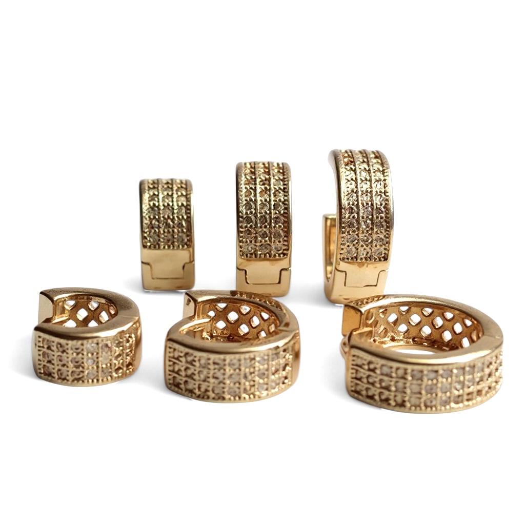 Delicado trio de brincos de argola cravejadas com zircônias brancas, banhado a ouro 18K