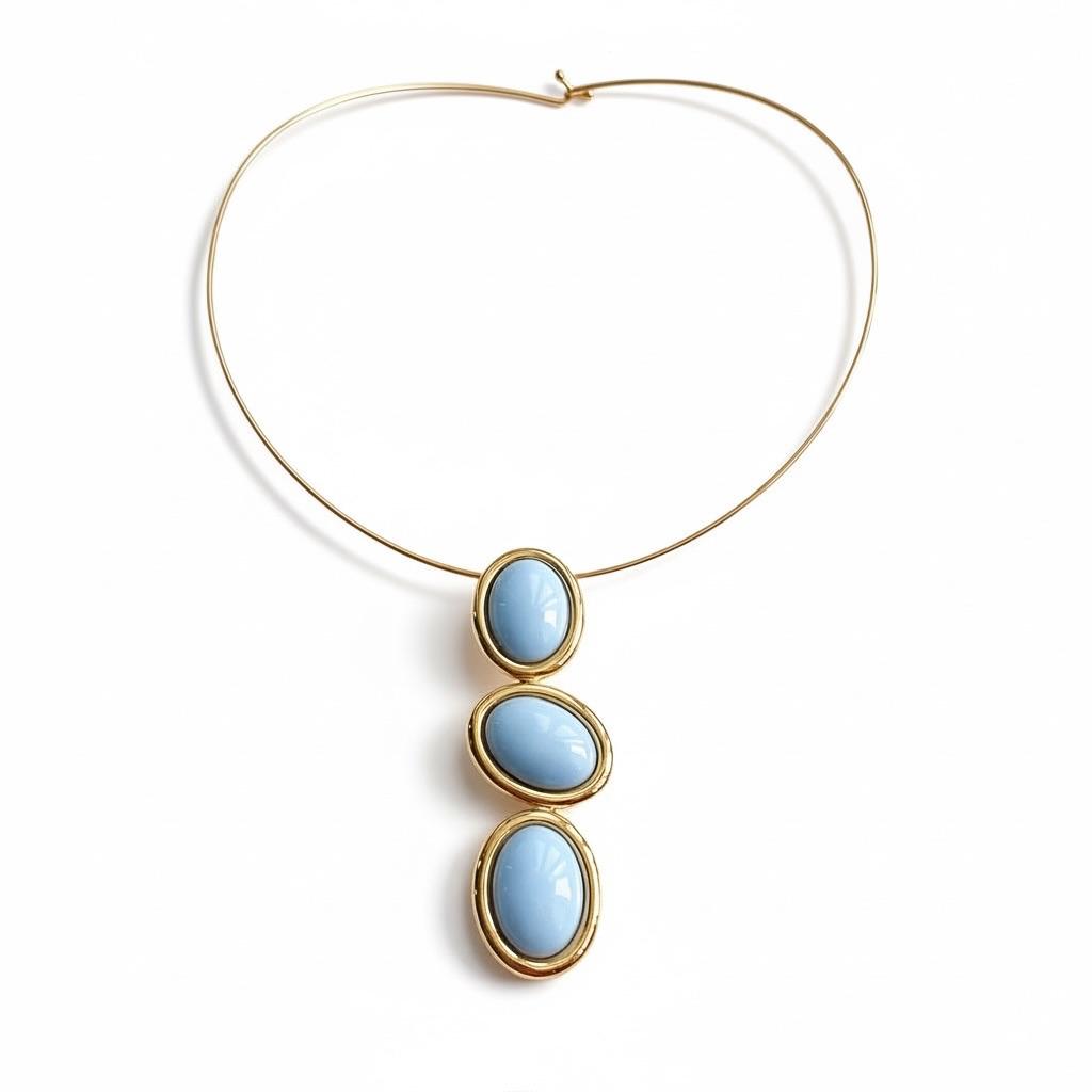 Choker composto por um aro rígido banhado a Ouro 18K, que cria um visual clean e minimalista, enquanto o pingente composto por três pedras ovais em tom azul céu traz harmonia, leveza e destaque imediato ao look.