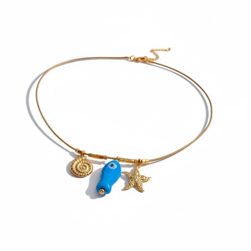 Choker confeccionado com corda náutica que possui 3 pingentes frontais em tema marítimo banhados a Ouro 18K: caracol texturizado, peixe esmaltado em tom azul irregular com detalhes em brilho e estrela do mar metálica. A composição combina elementos do mar com um design sofisticado, perfeito para looks leves e estilosos