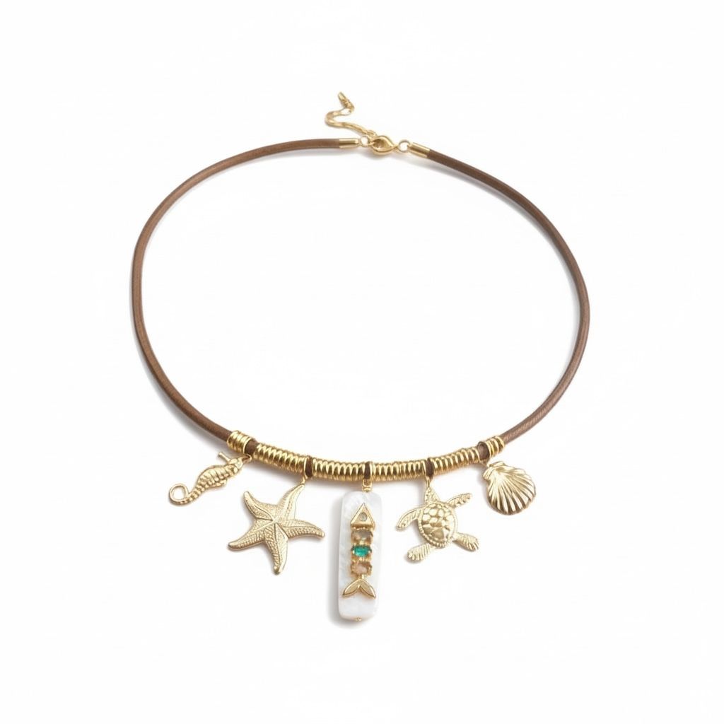 Colar confeccionado com corda náutica marrom, de espessura média, com acabamento metálico banhado a Ouro 18K. A peça apresenta 5 pingentes em banho Ouro 18K: cavalo-marinho, estrela do mar, peixe estilizado com detalhes coloridos em uma pérola, tartaruga marinha e concha. Os pingentes são distribuídos entre espaçadores metálicos, criando composição equilibrada e temática.
