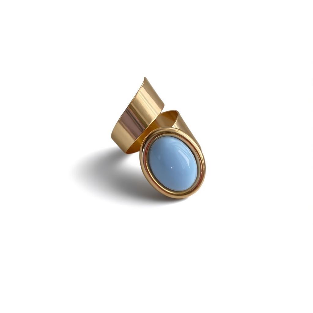 Anel regulável banhado a Ouro 18K, com uma pedra oval em tom azul céu que traz um toque de cor suave que se destaca em qualquer produção.