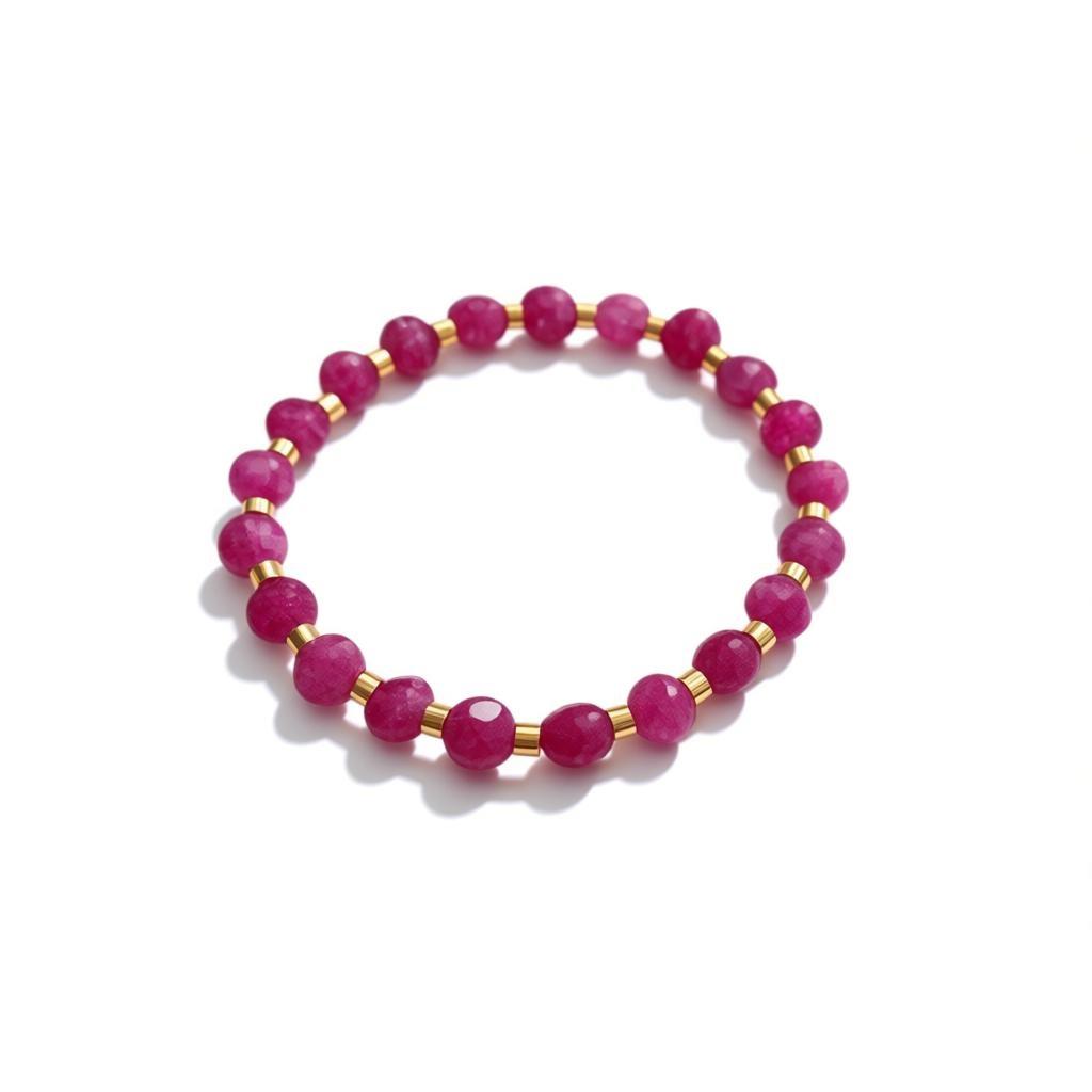 Pulseira de elástico composta por miçangas em tom rosa vibrante e espaçadores banhados a Ouro 18K. Ela traz um visual moderno e feminino, ideal para quem ama acessórios marcantes, mas cheio de leveza.